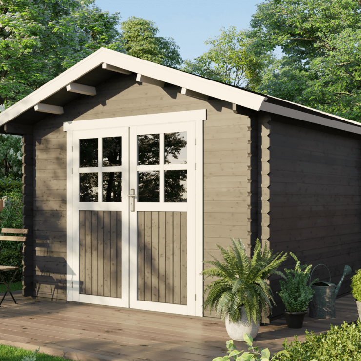 Hybrid cabins combining natural stonework with timber finishes for a durable, elegant rustic aesthetic.